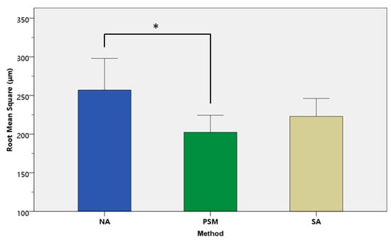 For the area outside of the tolerance level, which was regarded as occlusal errors in this study, the results are described in Table 1 and Figure 6. There were significant differences in the RMS values of the NA, PSM, and SA groups (p = 0.028). The RMS values calculated from all points outside of the tolerance area were 257.0 ± 73.9 μm in the NA group, 202.3 ± 39.3 μm in the PSM group, and 222.9 ± 41.9 μm in the SA group. From the post hoc analysis, the RMS of the PSM group was statistically lower than the NA group (Figure 6). The +AVG values were 210.9 ± 48.6 μm in the NA group, 173.1 ± 31.31 μm in the PSM group, and 194.7 ± 36.4 μm in the SA group. There was also a significant difference between the NA and PSM groups in the post hoc analysis (p = 0.040).