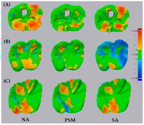 Representative images of the color-coded maps showing the deviations between the comparison data (NA, PSM, and SA) and the reference data (POST). The red-coded areas (i.e., positive deviation out of the tolerance range) suggested occlusal error that required clinical occlusal adjustment. (A) The PSM and SA groups showed less red-coded areas than the NA group. (B) In some cases, there were extensively blue-coded areas in the SA group, indicating over-correction. (C) Reduced red-coded areas were observed in different positions between the PSM and SA groups.