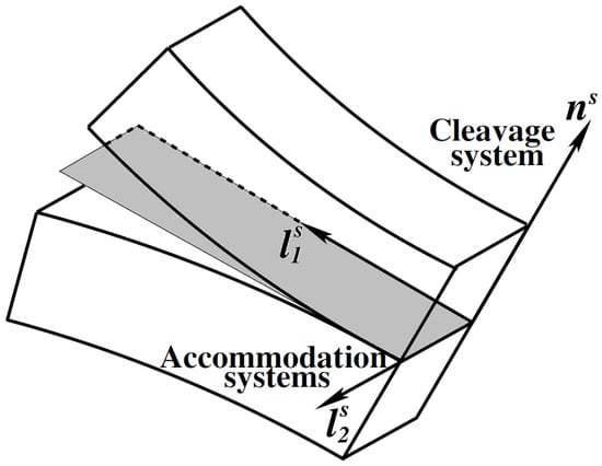 For three mode of fracture, damage evolution is calculated separately as , and the number of damage planes is determined from a given crystal structure. The opening of crystallographic planes with the normal vector can be defined as cleavage damage in the system and once cleavage has started, other damage systems are allowed to initiate for the inplane accommodation along orthogonal directions and , (Figure 2). Three damage criteria are associated to one opening and two accommodation systems: