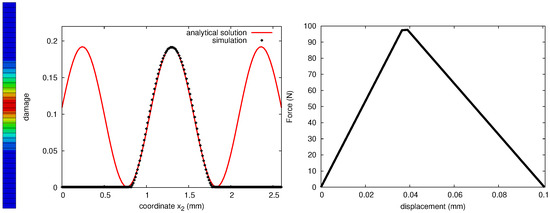 The regularization of a localized deformation with the proposed approach is demonstrated in a numerical model problem, where a bar with a length of 2.5 mm under tension is studied (Figure 3). An opening plane, normal to the direction of the bar is defined and at the center element, an initial defect is introduced where the damage threshold value is slightly reduced. Considering a rate independent damage evolution with linear isotropic softening and only active for opening mode, a microforce balance and the generalized balance law for the alternative case take the following form: