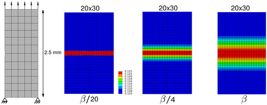 As a 2D example, a plate representing a 2D single crystal block under uniaxial tension with a horizontal cleavage plane is investigated (Figure 4). The localization is triggered with an initial geometric defect on the left edge and the cleavage plane is kept on the horizontal axis. The wave length of the localisation band is manipulated by the varying values . FEA results show that localization path is well in line with the cleavage plane and the localized deformation is captured with in a band whose size is mainly controlled by the length scale l defined in Equation (68).