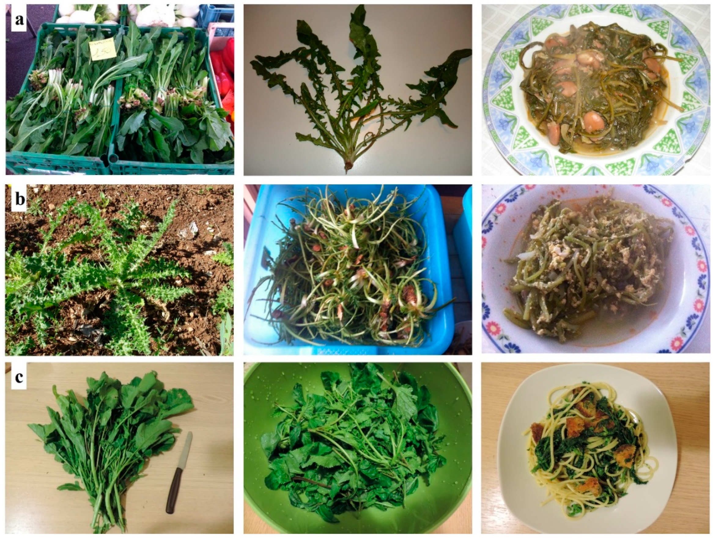 - Hadjichambis, A.C.; Paraskeva-Hadjichambi, D.; Della, A.; Elena Giusti, M.; De Pasquale, C.; Lenzarini, C.; Censorii, E.; Reyes Gonzales-Tejero, M.; Patricia Sanchez-Rojas, C.; Ramiro-Gutierrez, J.M.; et al. Wild and semi-domesticated food plant consumption in seven circum-Mediterranean areas. Int. J. Food Sci. Nutr. 2008, 59, 383–414. [Google Scholar] [CrossRef]