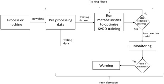 Currently, machine learning and nature-inspired algorithms are being applied in several research fields to obtain optimal results. Some real applications include medical diagnosis based on the patient’s symptoms [1], fraud detection in economic transactions [2], identification of patterns of investment in order to buy/sell in a more efficient manner [3], image detection to predict city traffic, machine failure and the design of autonomous vehicles, among others [4]. There are some previous studies regarding fault detection and fault diagnosis based on Dynamic Weight Principal Component Analysis (PCA) [5], Principal polynomial analysis [6], PCA and a Bayesian network [7], deep convolutional neural network [8], Hidden Markov Model and Bayesian Network [9], among others. However, statistical assumptions about the distribution of the process data should be made in some of these approaches. Support Vector Data Description (SVDD) [10] and Artificial Neural Networks (ANN) algorithms share the same concept using the linear learning model for pattern recognition. ANN tries to converge to a local minimum using the gradient descent learning algorithm and suffers from overfitting problems. On the other hand, SVDD tends to find a global solution during training since the complexity of the model has been taken into account as a structural risk in SVDD formation. ANN minimizes only empirical risk learned from training samples and SVDD considers not only the empirical risk but the structure risk. Thus, SVDD training results show better generalization capability than those obtained with ANN.