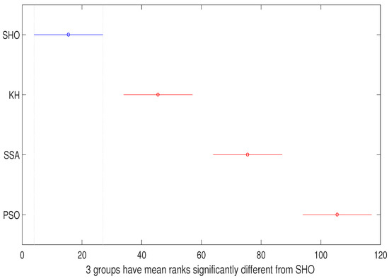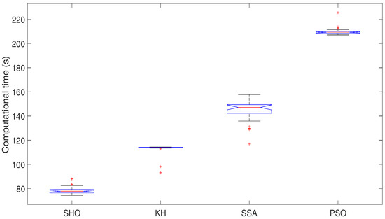 The parameters of the different metaheuristics were selected according to their authors and the corresponding values are specified in Table 2. The number of iterations was selected in experimental testing where it was determined as the maximum amount of iterations that produced changes in the results. The search range is from 0.001 to 600 for the hyper-parameters. Table 3 shows the different values and descriptive statistics of the F1 score metric and the computational times corresponding to 30 runs using each of the four approaches. As it can be seen, the SHO algorithm reaches the highest mean value of F1 score (0.9702) with a small variability i.e., standard deviation (std) equal to 0.0074. Furthermore, this approach presents the highest F1 score values in 80% of the experiments while SSA, KH, and PSO achieve similar performance only in 16, 13, and 0%, respectively. On the other hand, SHO presents the least computational time in the 100% of the runs achieving execution times two and even three times less than SSA and PSO. In addition, SHO presents the minimum variability with respect to the remaining approaches. In order to confirm the statistical significance of the results, a Mardia test is first performed to determine if the data present multivariate normal distribution. Since the data set is not normally distributed, the non-parametric ANOVA test of the Kruskal–Wallis is used. Figure 2 and Figure 3 show the corresponding box plots for the implemented approaches. As it can be seen in Figure 2, SHO reaches the highest median F1 score value with low variability. On the other hand, the remaining approaches present the equal median F1 score values. However, KH shows the highest variability on its results. Although SSA sometimes yields similar results than those of SHO, they are so sporadic throughout the runs which is the reason for the boxplot to show these values as outliers. Figure 3 clearly depicts that SHO achieves the best computational times since the highest outliers of SHO are below of the lowest valued reported by KH. Table 4 and Table 5 present the numerical results of the ANOVA test where for both cases (F1 score and computational time) the p-value is much lower than the significance level of 0.05. Thus, there is a statistical significance of the difference between the means of the results obtained by the four approaches. On the other hand, the high error in the sum of the squares (SS) in the F1 score analysis shows that there is a great variability which can not be explained by the predictors. Once considerable differences have been detected when using the Kruskal–Wallis ANOVA, a post hoc Tukey test is performed to determine the mean with the most significant difference. This analysis compares the means of all treatments with the mean of every other treatment and the best available method is considered in cases when confidence intervals are desired (for details, refer to [51]). Figure 4 and Figure 5 show the graph of the estimates and comparison interval. Each group mean is represented by a little circle and the interval is represented by a line extending out from the circle. Two group means are significantly different if their intervals are disjoint and they are not significantly different if their intervals overlap. As it can be seen, the SHO approach does not overlap with any other in both cases (F1 score and computational times), i.e., the Tukey test concludes that there is a significant difference between the SHO algorithm and the remaining approaches. This shows that SHO-SVDD offers a higher performance for fault detection in the plastic injection machine (F1 score is equal to 0.9702 in average) with a shorter computational training time. Finally, the overfitting effect is analyzed to test the SHO-SVDD generalization performance. The complete data set (normal and mixed operation samples) is used to implement a K-fold cross validation procedure. In addition, 5-fold (test 1) and 10-fold (test 2) cross validation are computed 30 times, and F1 score mean value is calculated i.e., a total of 150 and 300 training-test experiments are computed, respectively. The obtained F1 score mean values are 0.9701 for test 1 and 0.9714 for test 2, both are very close to F1 score mean value of 0.9702 obtained in the previous analysis. Considering this, it is concluded that the SHO-SVDD approach for fault detection presents a good generalization for this particular data set.