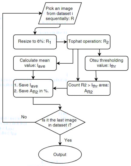 For two classes as in this study, minimizing the within-class variance is equivalent to maximizing the between-class variance since , where is the image total variance. The between-class variance is: