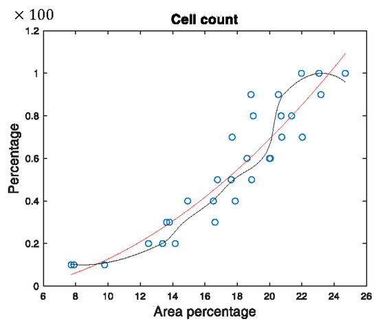 Regression models of the training data. There were 30 cell confluence images. The circle points represent the 30 data points. The red curve is the quadratic model and the black curve is the shape-preserving cubic interpolation.
