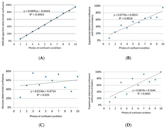 The measurement of cell confluence performed using various approaches. Each datum point represents a mean of the cell confluence determined by (A) the algorithm; (B) novice students (n = 6); (C) experienced researchers (n = 6) with a time limitation (1 min); or (D) experienced researchers without a time limitation. Cell photos were marked from 1 to 10, representing the increased cell number in the cell dishes. Five photos of each confluence condition were used for the evaluation.