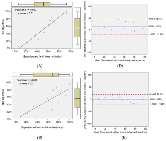The correlation of the algorithm-determined cell confluence and that determined by (A) experienced researchers with time limitation (examined the images in 1 min) and (B) experienced researchers without time limitation. (C) The correlation of the cell confluence levels was measured by experienced researchers with or without time limitation. The Bland–Altman analysis determined the 95% limit of agreement between (D) the novices and experienced researchers with time limitation (examined the images in 1 min); (E) novices and experienced researchers without time limitation; and (F) novices and the algorithm.