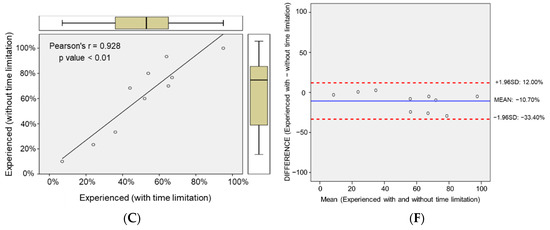 We then examined the correlation of cell confluence levels predicted by experienced researchers and the Confluence-Viewer program. Interestingly, the results showed a good correlation between the algorithm- and experienced-researcher-predicted cell confluence with or without time limitation (Figure 7A,B). Although a longer determination time for experienced researchers decreased their prediction accuracy, a high correlation remained in these two conditions (Figure 7C). Thus, the algorithm-determined cell confluence is comparable to experienced researchers’ predictions. Again, the Bland–Altman analysis was used to determine the 95% limit of agreement. The confluence determination results of experienced researchers with or without time limitation versus the algorithm are shown in Figure 7D,E. Additionally, the cell confluence determined by experienced researchers showed little bias with or without time limitation (Figure 7F). From Figure 7E, we can see that the difference between results from experienced researchers (without time limitations) and the algorithm is very limited. The standard deviation of the difference is the smallest among all comparisons (Figure 6D–F and Figure 7D–F). This result reveals that the proposed software system is reliable and has the potential to replace experienced researchers’ work in cell confluence quantifications.