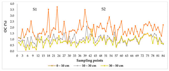 Organic carbon (OC) content in all sampling plots and depths for the two studied soil sectors (S1 and S2).