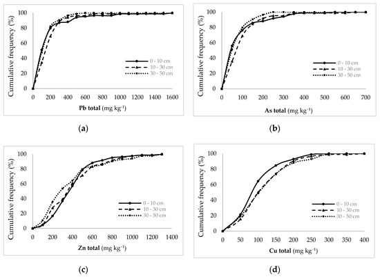 Cumulative frequency-distribution curves of the main PHEs twenty year after the accident and in the three studied depths (a) Total Pb; (b) Total As; (c) Total Zn; (d) Total Cu concentrations.