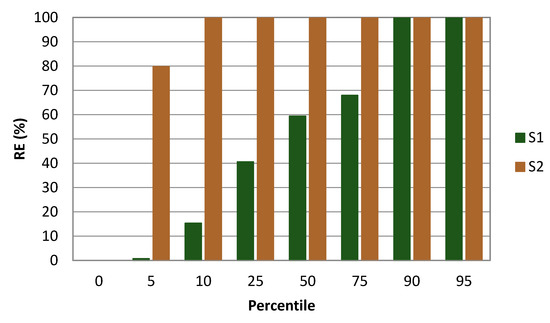 Percentile values for the root elongation percentage (RE) in relation to the control (distilled water) of Lactuca sativa seeds in the two studied soil sectors (S1 and S2).