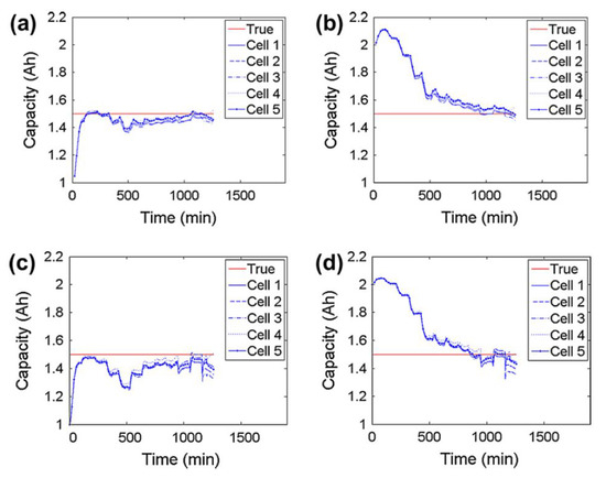 - Why will the smaller initial value of battery usable capacity lead to a rapid convergence speed?As can be observed from Figure 1a–d, although the steady state error was similar for 1 Ah or 2 Ah, the convergence speed of the estimation was faster with the lowest initial value.