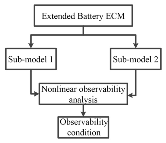 Hence, a theoretic and systematic observability analysis method is proposed specifically for the extended battery ECM in this paper. Firstly, the characteristic of the battery ECM is used to decompose the original ECM into two sub-models. Then, nonlinear observability analysis method is applied for each sub-model. A schematic diagram of the proposed analysis method is shown in Figure 4, where the arrows represent the analysis process.