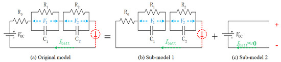 Based on the same approach, we consider that in each SOC interval, the ECM is a linear model of the battery. Hence, the superposition principle can be applied [30]. The battery ECM displayed in Figure 5a is split into two sub-models: