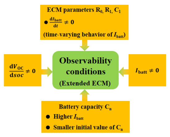To summarize, a schematic resume of the obtained necessary observability conditions for the extended battery ECM is shown in Figure 6.