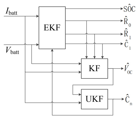 On the other hand, a more flexible estimation framework based on two observers is called the dual estimation method. The double EKF [14], double UKF [17], double sliding mode observer [20], double H∞ observer [21], and double particle filter [22] are introduced to the dual estimation framework, where battery parameters and states can be estimated separately with different time scales. Additionally, merging the advantages of different filtering techniques is another objective of the dual estimation method. For example, the UKF and H∞ observer were applied in the dual estimation framework in [23], in which the H∞ observer was used to have a robust battery parameter estimation, and more accurate SOC estimation was achieved with UKF.