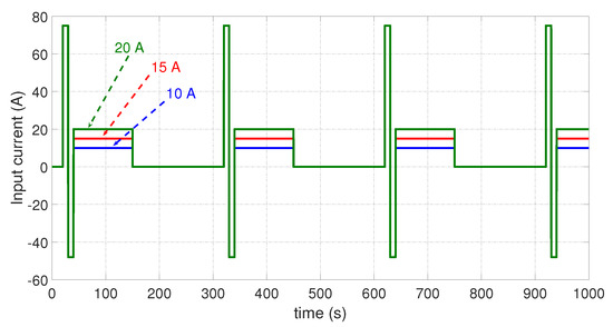 Firstly, as shown in Figure 8, three special periodic input currents were considered. In one cycle (300 s), the LIB was discharged and recharged by a dynamic current during a small time period at the beginning; then, a constant discharge current was applied to the battery; and finally, the battery was idle until the next period. Besides, in order to verify whether the current value will affect the estimation of the battery capacity, three constant discharge values were selected, namely 10 A, 15 A, and 20 A.
