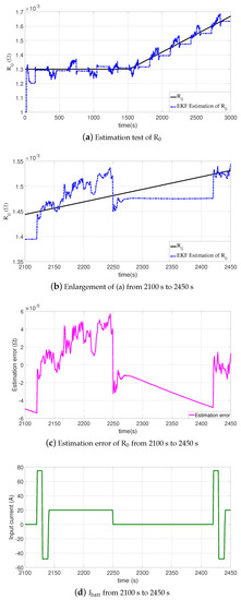The result is shown in Figure 9a. The dashed line is the estimation of by EKF. Figure 9b is the enlargement of the estimation result in Figure 9a from 2100 s to 2450 s, and Figure 9c is the corresponding estimation error, while Figure 9d is the corresponding input current. From Figure 9c and Figure 9d, we can deduce that the observer estimated efficiently the resistance only when the input current was variable. Besides, the fluctuating characteristic of the estimated in Figure 9a could be found evidently. This can be explained from the perspective of observability. The fluctuating characteristic of the estimated was due to the input current dynamics.