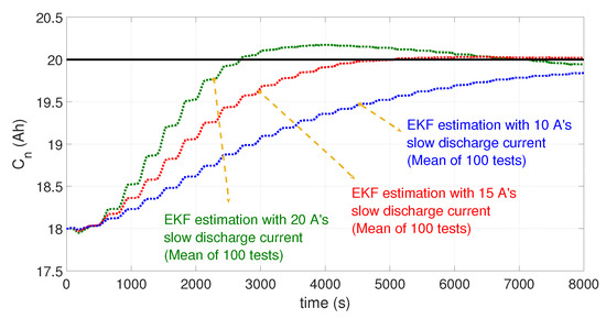 On the other hand, three previously mentioned input currents were fed to the battery ECM in order to verify whether the input current value would influence the observability condition for battery capacity estimation. Considering the effect of randomness in measurement noise, a simple quasi-Monte Carlo simulation test was conducted with 100 estimations. The estimation result based on (9) is shown in Figure 10. It confirmed that a higher value of the battery input current improved the convergence speed of the battery capacity estimation.