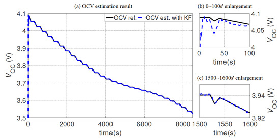 First of all, as a specific term appeared in the new structure, the estimation result of OCV is shown in Figure 12 and Figure 13. Firstly, as is shown in Figure 12, the OCV estimation converged rapidly to the reference value and could track the dynamic change of the battery OCV. Then, from the OCV estimation error in Figure 13, KF was capable of providing an accurate estimation, which was important to connect the other two estimation modules.