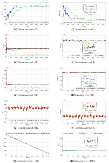 Then, the estimation results of the other parameters are shown in Figure 14. Several improvements brought by the new structure should be noticed. Firstly, as can be seen from Figure 14a,b, compared to joint EKF or joint UKF, the main improvement with the new structure came from the estimation of the battery capacity. Not only the convergence speed was more rapid, but also the estimation was fluctuating less and more accurate. Secondly, it can be observed from Figure 14c–f that the new framework improved the estimation accuracy of the RC network. Thirdly, as can be seen from Figure 14i,j, due to the improvement of the parameter estimation, the determination of the battery SOC was also improved.