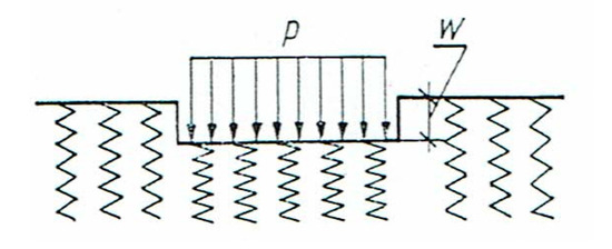 Any point of the surface of the substrate dislocates independently from one another. This is because at each point, the medium of the substrate contains a flexible independent spring with equal stiffness and an infinitely close arrangement [7,8]. In a different way, a Winkler substrate has been defined as a system of densely spaced rods having a specific flexural stiffness [9]. A more accurate model is an elastic layer presented in an approximate manner. The coefficients included in calculations are dependent on the material constants specific to this layer [10]. Another option is to assume that the substrate is liquid whose specific gravity is later included in calculations. Then, the buoyancy is exerted by the weight of the plate that lies on a given floating substrate [11]. Figure 1 schematically presents the Winkler elastic substrate, while Formula (1) indicates the above-described correlation [11].