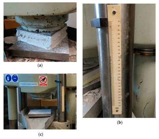 Polyurethane foam sample during compression in the testing machine (a), straight edge used for measuring deflections of samples (b), universal testing machine with a visible straight edge prior testing (c).