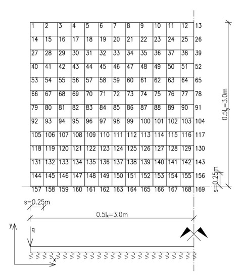 The slab was divided by a square discretization grid with a mesh size of sx = sy = 0.25 m. The slab adopted for calculations was characterized by a static diagram, with all edges free (unfixed), loaded in strips circumferentially with the load equal to q = 30 kN/m. The static diagram of the slab after taking into account the symmetry axis along with the assumed division mesh and acting load is shown in Figure 4 [38].