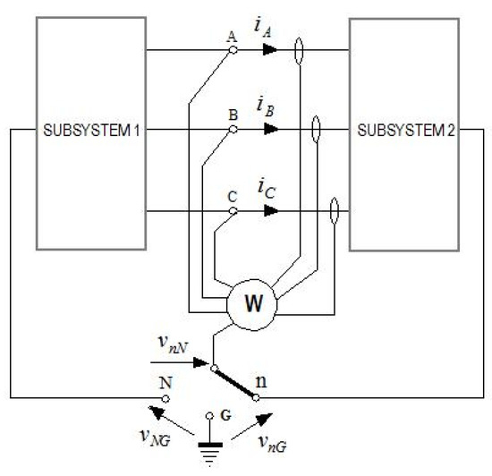 The apparent power of any part of a power system is, in our opinion, a formal quantity that measures the combined effects of all the power phenomena in that part of the system. Hence, when a power analyzer registers different values of the apparent power at the PCC of two directly connected subsystems (Figure 1) based on the use of different voltage reference points, it suggests the existence of various power phenomena with effects derived from the voltage reference point. Therefore, if both subsystems in Figure 1 are star-connected with neutral points N and n, the power analyzer would register the apparent power of subsystem 1 if N is used as the voltage reference point, and that of subsystem 2 if n is used as the voltage reference point. If the grounding point G is used as the voltage reference, the apparent power registered by the power analyzer would not be that of either subsystem.