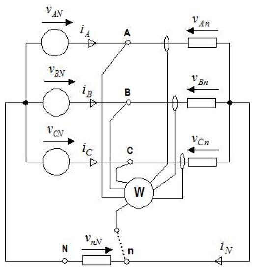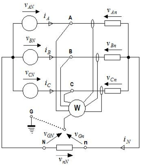 Hence, the load apparent power difference in the system in Figure 3 measured by the power analyzer using either the load neutral point () or an ideal grounding point () as the voltage reference point can be determined from the load component of the neutral-displacement power (). Proceeding in the same way,
