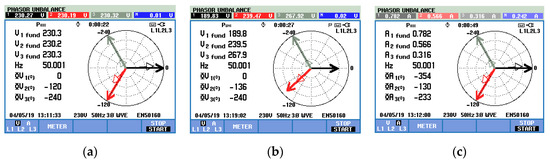 The value given by Equation (1) would be registered by a power analyzer placed at the PCC (A, B, or C) of the system in Figure 2 if the load neutral point (n) is used as the voltage reference. According to Kirchhoff’s second law, the line-to-neutral instantaneous voltages in the load phases () can be expressed as functions of the source line-to-neutral instantaneous voltages () and the neutral-point displacement voltage (), as follows: