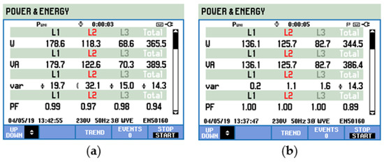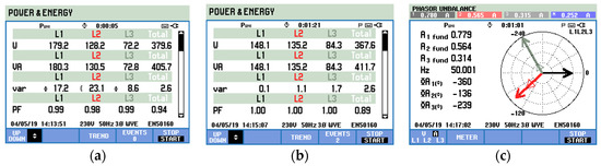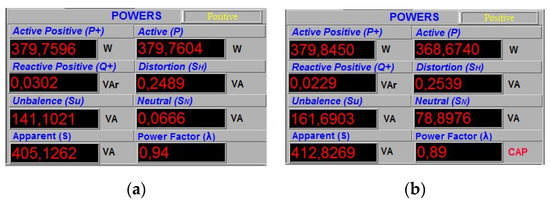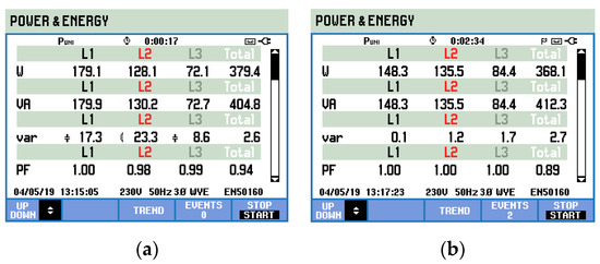 The apparent powers measured by the SIMPELEC (Figure 9) and Fluke 437 (Figure 10) power analyzers are presented in the third column of Table 5. The neutral-displacement powers were measured by the SIMPELEC power analyzer according to Equations (27), (28), and (35).