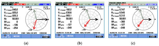 Screenshots of the Fluke 437 power analyzer for sinusoidal and unbalanced source voltages: (a) source voltage; (b) load voltage; (c) line current.