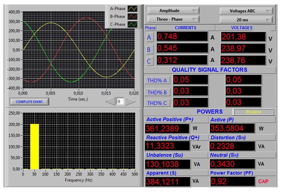 In this practical application, the source was adjusted to supply sinusoidal and unbalanced voltages with a zero-sequence component of 38.66 V (Table 4). The load and neutral path resistances were maintained at the same values as in the previous laboratory application. The source conditions included displacement of the source and load neutral points with respect to the real grounding point of the installation.