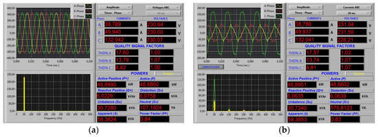The source and load voltages show the effects of the neutral displacement phenomenon. While the source voltages stayed quasi-balanced, with values around 230 V (Figure 13a), the load voltages became unbalanced, with over-voltages greater than 231 V in phases A and B, and sub-voltages (228.21 V) in phase C. The power effects caused by the non-negligible neutral conductor impedance were determined by the neutral-displacement powers, which were 575.81 VA for the load and only 107.19 VA for the source (Table 8).