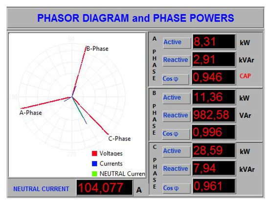 An electrical network of the utility Eléctrica de Vinalesa SCV, Valencia, Spain, was used for this practical experience. The waves of the line currents and source voltages, as well as the source and load powers registered by the SIMPELEC power analyzer, are shown in Figure 13a,b. The network power was supplied by a 400-kVA 20-kV/400-V Dyn11 three-phase transformer through a three-phase four-wire balanced buried line of cross-section 25 mm2 and length 28 m (from the transformer to the load distribution panel). The power consumptions of each phase of the load are shown in Figure 14. The line currents were distorted and strongly unbalanced (Figure 13b), while the voltages were hardly distorted (Figure 13a).
