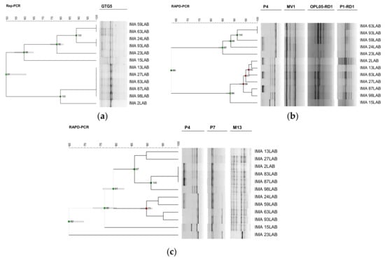 Screening of the best discriminating tool carried out on 12 selected L. sanfranciscensis isolates characterizing Protected Designation of Origin (PDO) Tuscan bread sourdough. Dendrograms obtained from unpaired group method with arithmetic average (UPGMA) analysis, using Dice’s coefficient, of (GTG)5 repetitive element sequence based-polymerase chain reaction (rep-PCR) profiles (a), of combined random amplified polymorphic DNA (RAPD)-PCR profiles, obtained using P4, MV1, OPL-05 + RD1 and P1 + RD1 primers (b) and using P4, P7 and M13 primers (c). The scale indicates the similarity level. Cophenetic correlation is shown at each branch by numbers and coloured dots, ranging between green-yellow-orange-red, according to decreasing values.