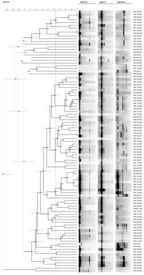 The reproducibility of fingerprints was assessed by comparing the combined fingerprinting patterns, obtained using DNA prepared from two separate cultures of the same ten randomly selected strains (L. sanfranciscensis IMA 3LAB, 18, 27, 45, 55, 56, 76, 94, 98 and DSMZ 20451T). All pairs of duplicates were amplified in different PCR reactions and the average similarity coefficient was calculated as described by Eriksson et al. (2005) [].