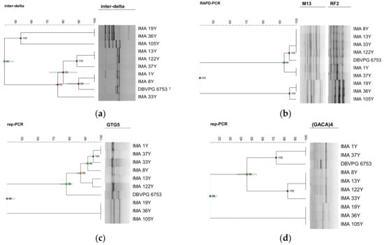 Many studies have focused on the intraspecific characterization of LAB, while only a few investigated sourdough yeasts. Among DNA-fingerprinting methods, yeast intraspecific heterogeneity has been studied using RAPD- and rep-PCR. The former has been successfully used, with M13 and RF2 primers, to differentiate three distinct biotypes out of 58 Saccharomyces cerevisiae strains from southern Italian sourdoughs []. Recently, Palla et al. (2019) revealed a high polymorphism among the 77 S. cerevisiae isolates from Tuscan sourdoughs, using inter-delta region analysis []. Rep-PCR with (GACA)4 primer was utilized to reveal the composition of the yeast microbiota of 18 traditional Italian sweet sourdoughs and 19 typical Italian bread sourdoughs, respectively [,]. Vigentini et al. (2014), using intron splice site dispersion (ISS-PCR) and (GTG)5 rep-PCR analyses, discriminated different strains within the species Candida milleri (now reclassified as Kazachstania humilis) [].