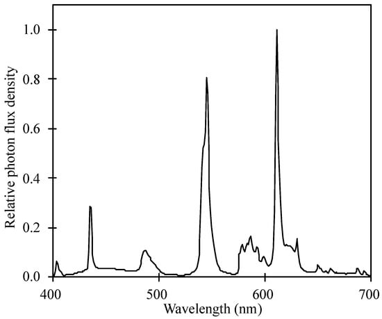 Photosynthetic active radiation (400 to 700 nm) spectral distribution graph for cool white fluorescent (4100 K) used for the three light intensity treatments. Spectral distribution was normalized with max 1.0.