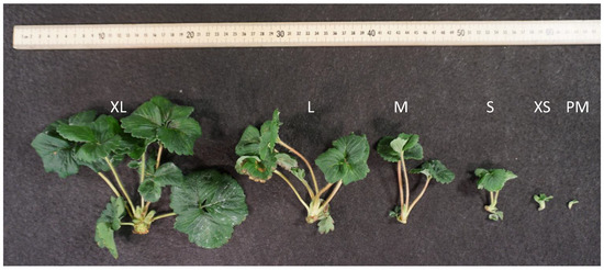 Every week, crown diameter, number of leaves, stolons, and daughter plants were recorded for each stock plant. After 12 weeks (9 weeks of daughter plant production period), all stolons were cut from the base. Daughter plants were excised from the stolons; and fresh mass (electronic scale), crown diameter (electronic caliper), leaf count (leaves greater than 1 cm), leaf area (LI-3100 Area Meter, LI-COR Inc., Lincoln, NE, USA), and dry mass (electronic scale after dried for 72 h at 65 °C) were measured. Daughter plants were grouped into six categories based on the crown diameter size (mm) (Figure 2) as follows: extra-large (XL) greater than 11, large (L) 8.5 to 11, medium (M) 6 to 8.5, small (S) 3.5 to 6 mm, extra-small (XS) smaller than 3.5, and premature (PM) daughter plant buds (Figure 2). In addition, dry mass was measured on each stolon without daughter plants. This first cycle was from week 1 to 12 (01 to 12 weeks) in this experiment.