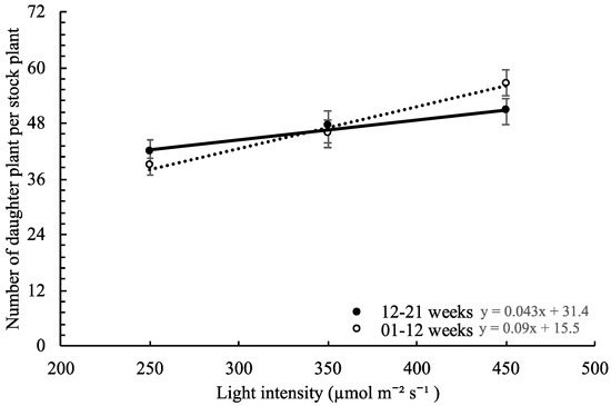 Effect of light intensity (mean ± standard error) on the total number of daughter plants per stock plant of day neutral strawberry “Albion”. Open circles (○) represent data collected for 01 to 12 weeks and filled circles (●) represent data collected for 12 to 21 weeks. Dotted or solid lines represent significant linear regression (p ≤ 0.05).