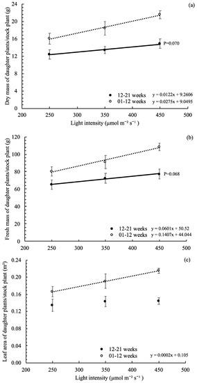 The effect of light intensity on total dry mass, total fresh mass, and total leaf area of all daughter plants harvested after each growing cycle is shown in Figure 4a–c, respectively. For the 01 to 12 week cycle, the total dry mass and fresh mass of all daughter plants harvested per stock plant increased with an increase of light intensity. For the 12 to 21 week cycle, the increase was less evident, but the trend was still present (p = 0.070 and p = 0.068). The total leaf area of all daughter plants per stock plant increased with an increase of light intensity for the 01 to 12 week cycle but did not increase for the 12 to 21 week cycle.