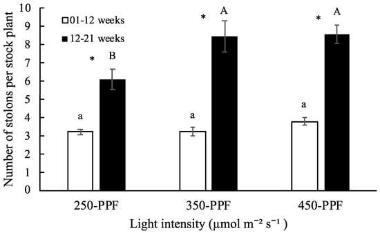 Effect of light intensity on stock plant stolon number of day neutral strawberry “Albion”. * represents differences between the 01 to 12 week cycle and the 12 to 21 week cycle (p ≤ 0.05). Lowercase and uppercase letters represent differences between light treatments by growing cycle (p ≤ 0.05).