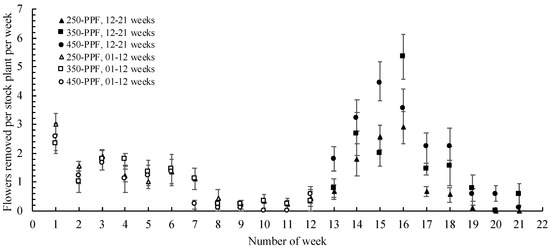 Flower removed per stock plant per week of day neutral strawberry “Albion”. Open markers (