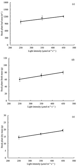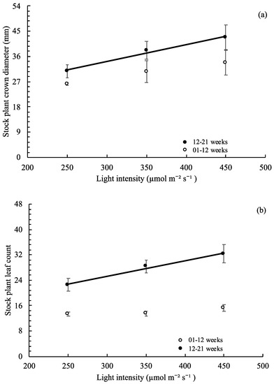 (a) Effect of light intensity on stock plant crown diameter; (b) leaf count; (c) leaf area; (d) fresh mass; and (e) dry mass, of day neutral strawberry “Albion”. Open circles (○) represent data collected for the 01 to 12 week cycle and filled circles (●) represent data collected for the 12 to 21 week cycle. Solid line represents significant linear regression (p ≤ 0.05).