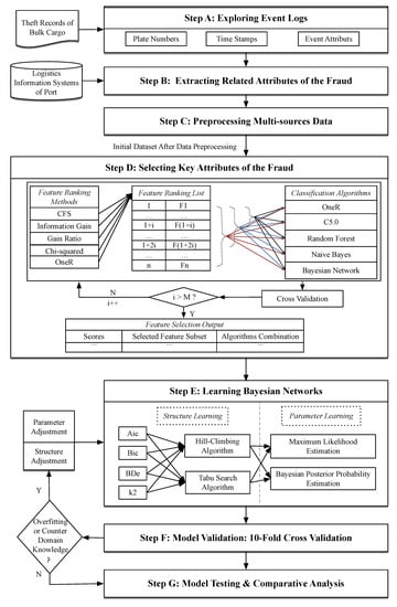 Figure 1, consists of three main parts: (a) feature selection; (b) Bayesian network learning; and, (c) model validation, testing and comparative analysis.