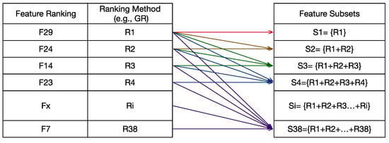 Table 3 and 38 feature subsets are generated including S1 = {R29}, S2 = {R29, R24}, S3 = {R29, R24, R14}, S4 = {R29, R24, R14, R23}, …, S38 = {R1, R2, …, R38}. Hence, evaluating and selecting the most effective subset of features for classification is the next task.