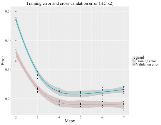 We first equally divide the whole dataset into three subsets, keeping the same proportion of risk delivery in each subset as in the original dataset. Then, two subsets are used as the training set for learning and validating the model. The last subset is used as the test set for testing the model performance. Bayesian networks are able to graphically present the dependency between features through its structure topology. However, it could be difficult to understand or explain in case of overfitting, which means a very complicated network structure. Hence, in this study, we try to choose an optimal value for the maximum number of father nodes while learning the network structure, in order to insure that the structure learned is both explainable and effective. As the parameter ‘mapx’ increases, errors of training and cross-validation decline sharply and the level of using combinations of structure search algorithms, score functions and parameter learning algorithms as well. Moreover, in the case of a maximum of five father nodes, errors are at their minimum independent of the combination. Thus, we determine the maximum number of father nodes as five. Using the structure search algorithm with HC, the score function with k2, the parameter learning algorithm with Bayesian posterior probability estimation is presented in